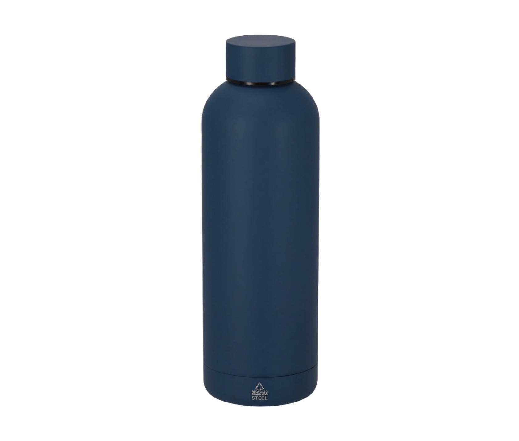 Bouteille Thermique 500 ml : Double paroi en acier inoxydable avec bouchon à vis et badge de recyclage.